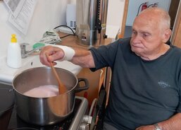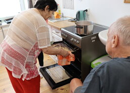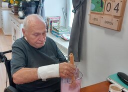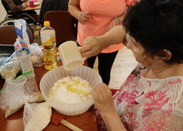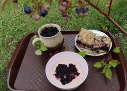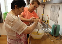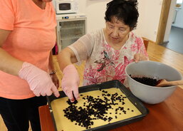 Klientka paní H. připravila těsto, na které nasypala borůvky a posypku – s tou jí pomohla pečovatelka. Do sladkého tvoření se zapojil i pan K., který uvařil vanilkový pudink, rozdělil ho do misek a ozdobil zavařenými borůvkami.