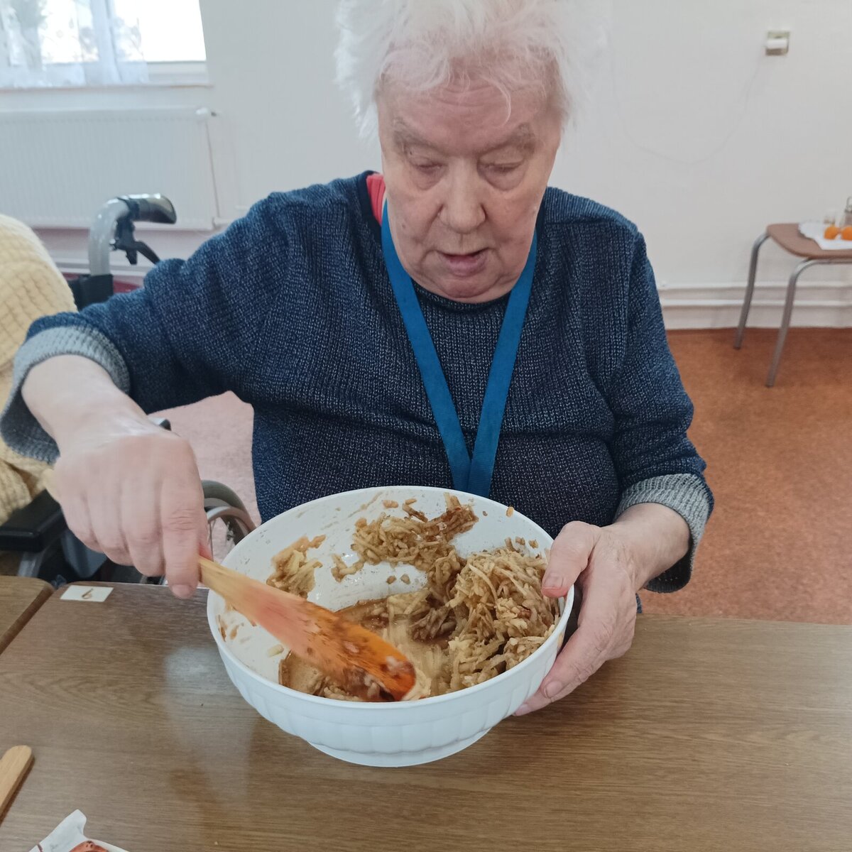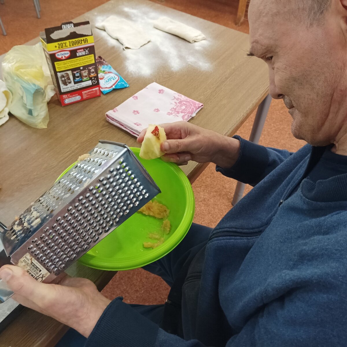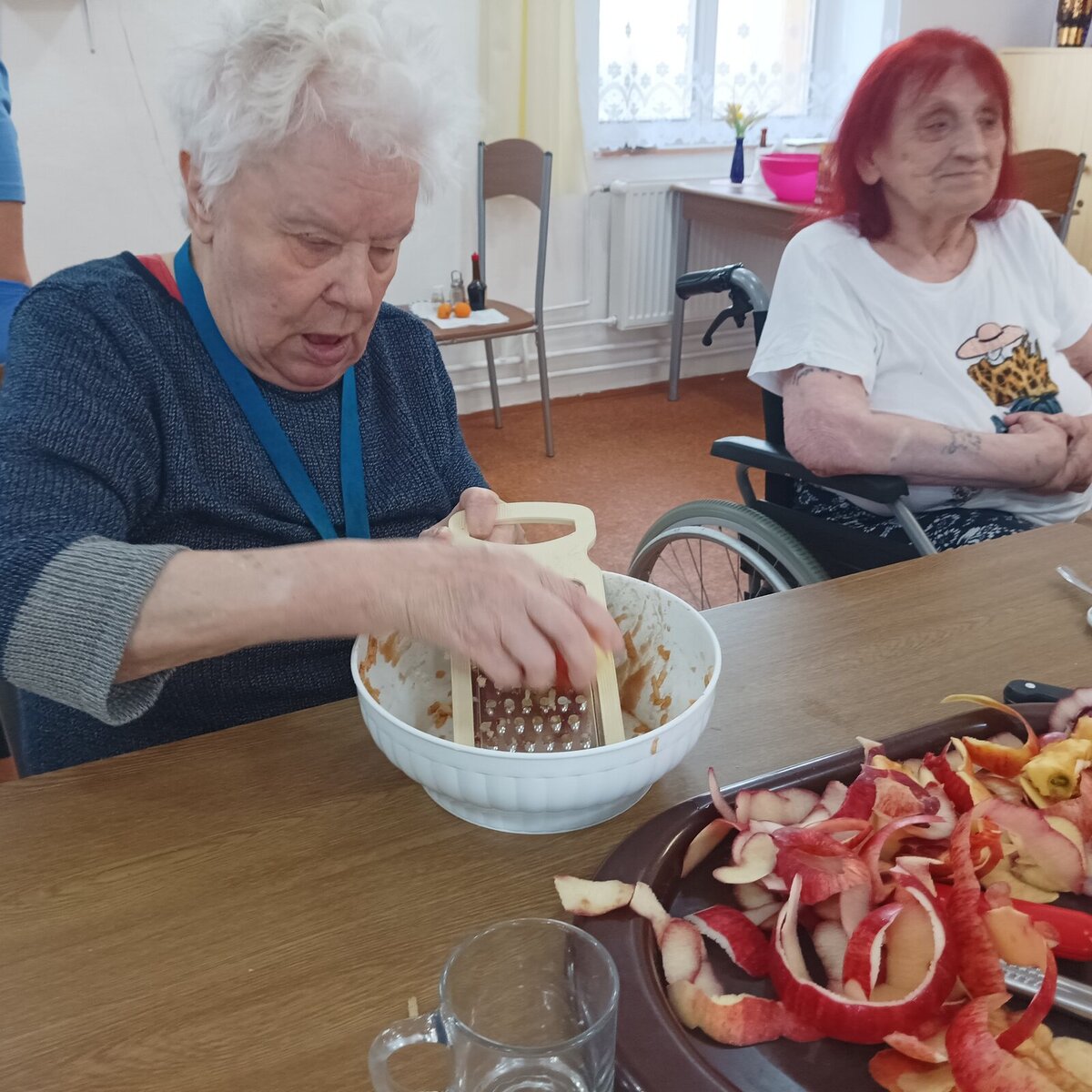 Pečení je mezi seniory velmi oblíbenou aktivitou. Možnost připravit si dezert a pár minut po vytažení z trouby si na něm pochutnat je pro ně vždy velkým potěšením. Tentokrát se společnými silami pustili do pečení jablečné buchty a závinů. „Klienti se s chutí zapojili do příprav – míchali těsto, strouhali jablíčka a pomáhali, kde bylo potřeba. Práce jim šla krásně od ruky a vládla příjemná atmosféra,“ popsala koordinátorka péče Vladislava Koisová.