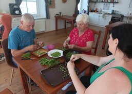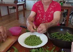 Nejdříve přišel na řadu hrášek. Při dobývání zelených kuliček si senioři na části úrody pochutnali, zbytek zamířil do mrazáku, kde počká na další využití.
