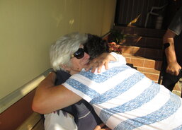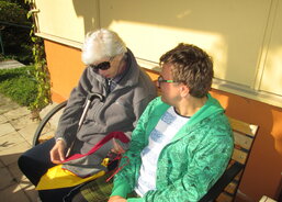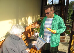 V létě to sice nestihli, ale i v září bývá ještě hezky a tak pracovnice stacionáře domluvila s paní učitelkou Koldovou návštěvu na úterní dopoledne. Tomáš byl na návštěvu dobře připravený. Paní učitelce namaloval obrázek, který ji potěšil, a na šicím stroji společně s Editou pro ni ušili ponožky. Posezení na zahradě vyšlo i díky pěknému počasí a společně strávený čas potěšil všechny. Takto návštěvu zhodnotil Tomáš: „Paní učitelka byla ráda. Dali jsme jí ty ušité ponožky a obrázek… Děkovala, no prostě byla ráda a vzpomínala, jak mě měla z českého jazyka. A někdy přijď zase!“ vzpomínal, jak na něj volala. „Dostal jsem krabičku borůvek, které nasbíral ráno její manžel. Jo a potkali jsme ještě jednu paní učitelku, která mě učila v první třídě. Ptala se, jestli pořád předpovídám počasí,“ usmál se a dodal: "No teď už míň.“