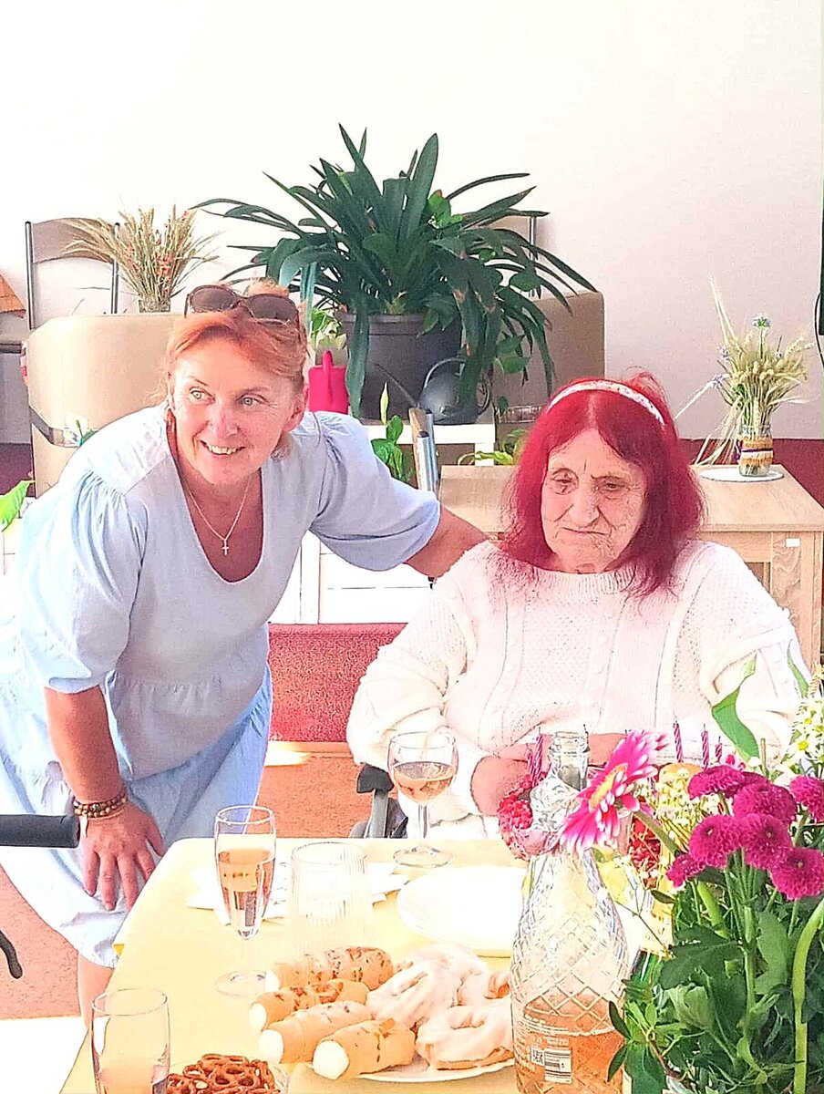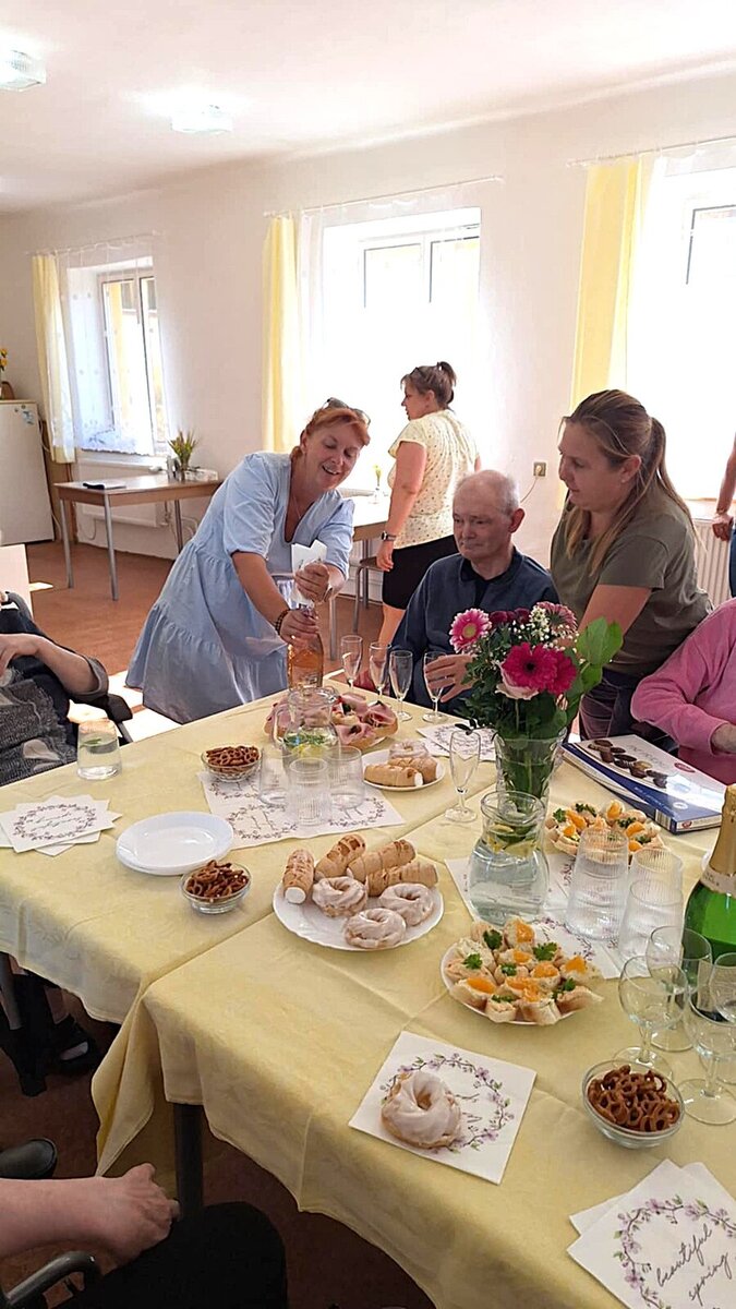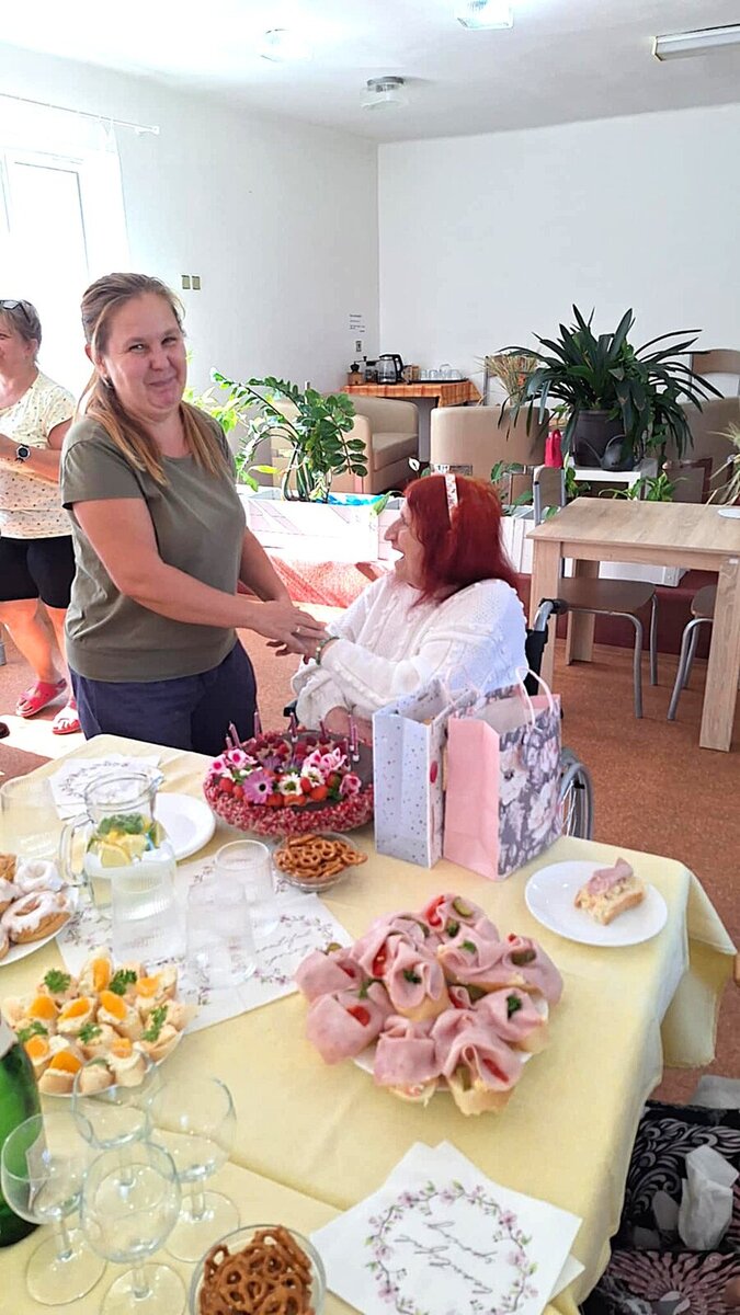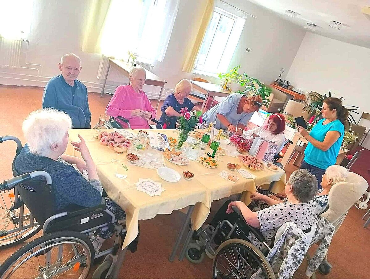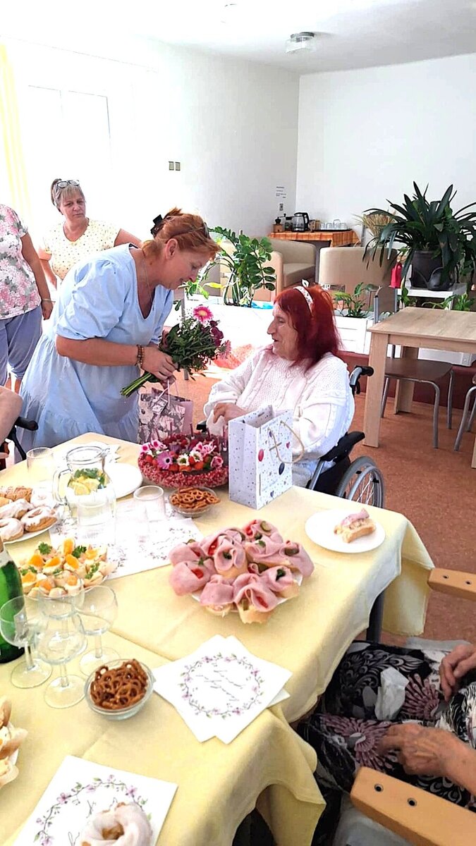 Odpoledne se neslo v radostné a přátelské atmosféře. Klientka přijímala gratulace i srdečná přání od ostatních klientů a pracovníků domova, což jí udělalo obrovskou radost. Všichni přítomní si společně užili chvíle plné pohody, úsměvů a vzpomínek.