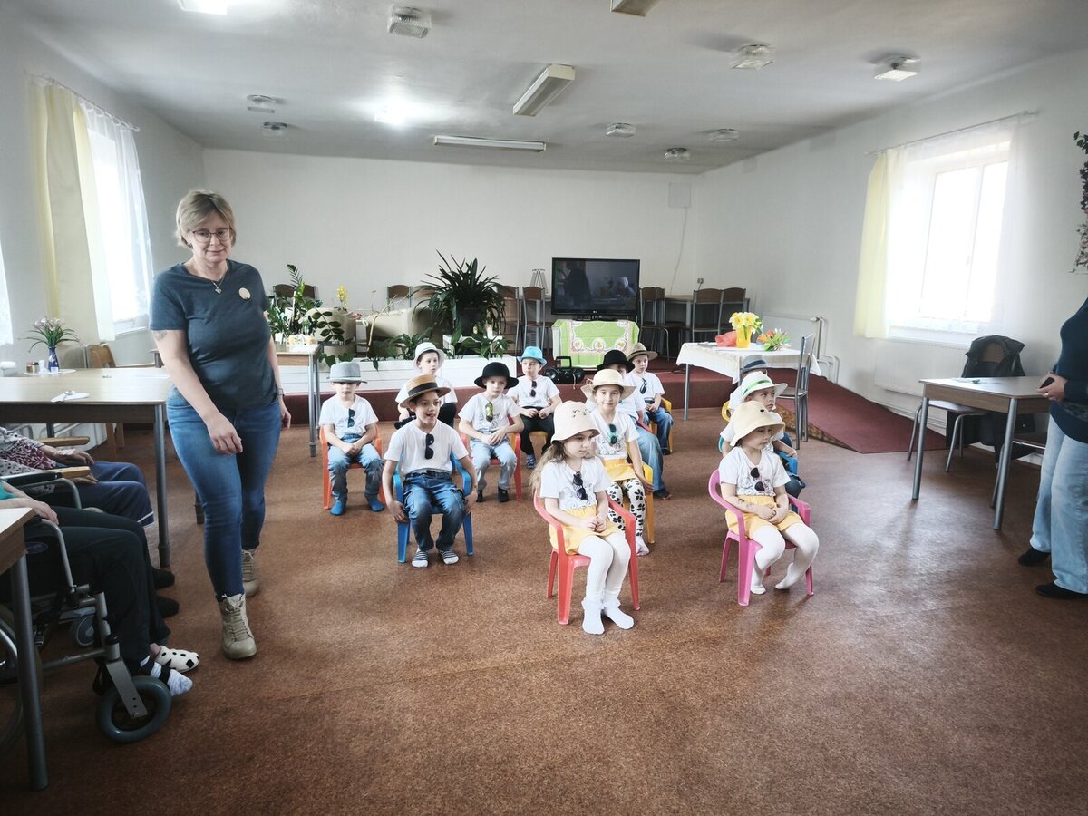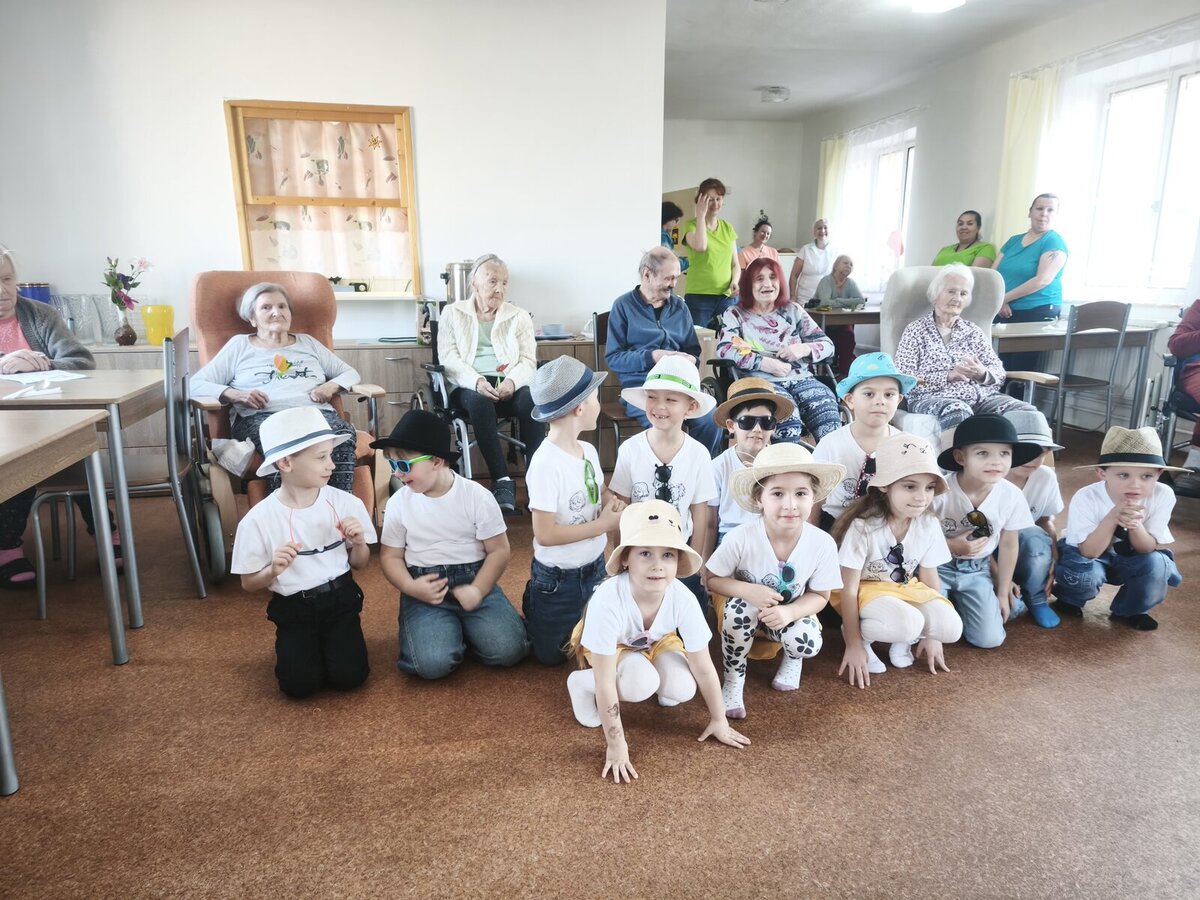 Vyvrcholením návštěvy bylo předávání ručně vyrobených kytiček, které děti s radostí rozdaly všem klientkám jako milou pozornost k nedělnímu svátku. „Nezapomnělo se ani na imobilní klientky, které děti navštívily přímo na pokojích. Je hezké vidět, jak se prolínají generace,“ uvedla koordinátorka péče Vladislava Koisová.