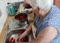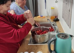 Senioři si jahody sami očistili, pomačkali je a s pomocí paní Kučové i uvařili. Společné vaření provonělo celý domov a přineslo radost i vzpomínky na letní zavařování z mládí.