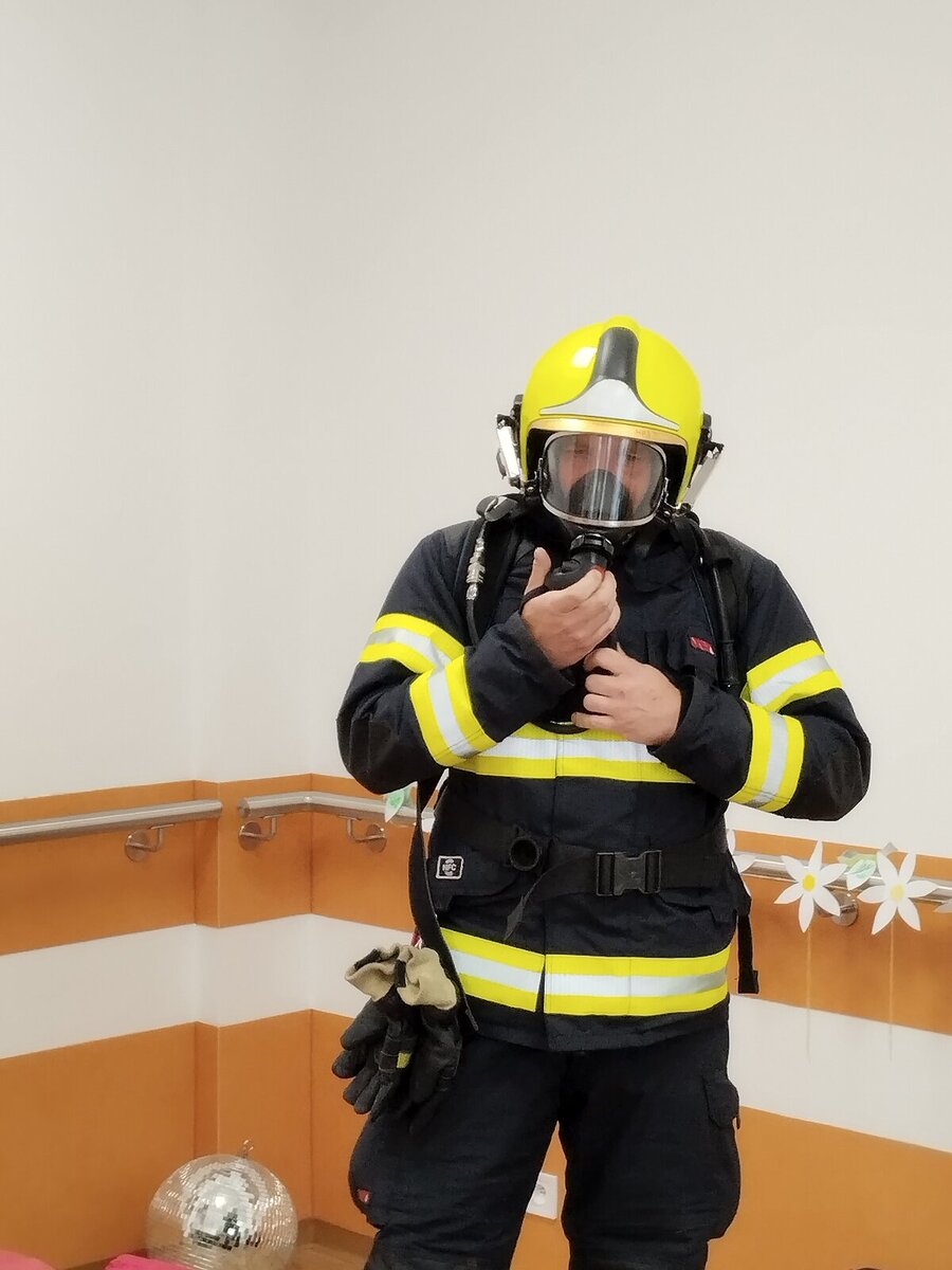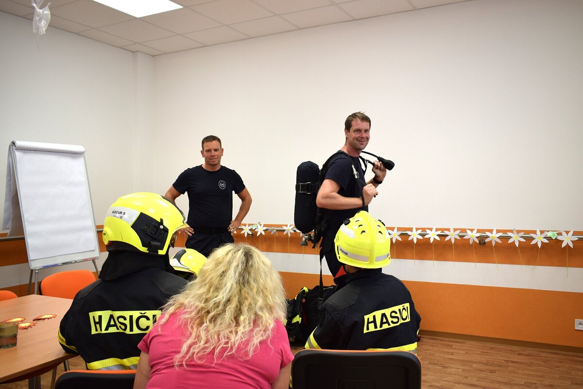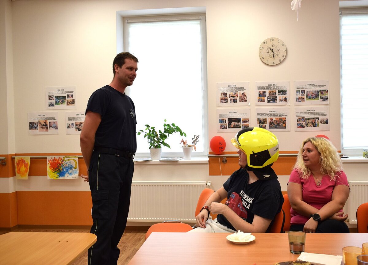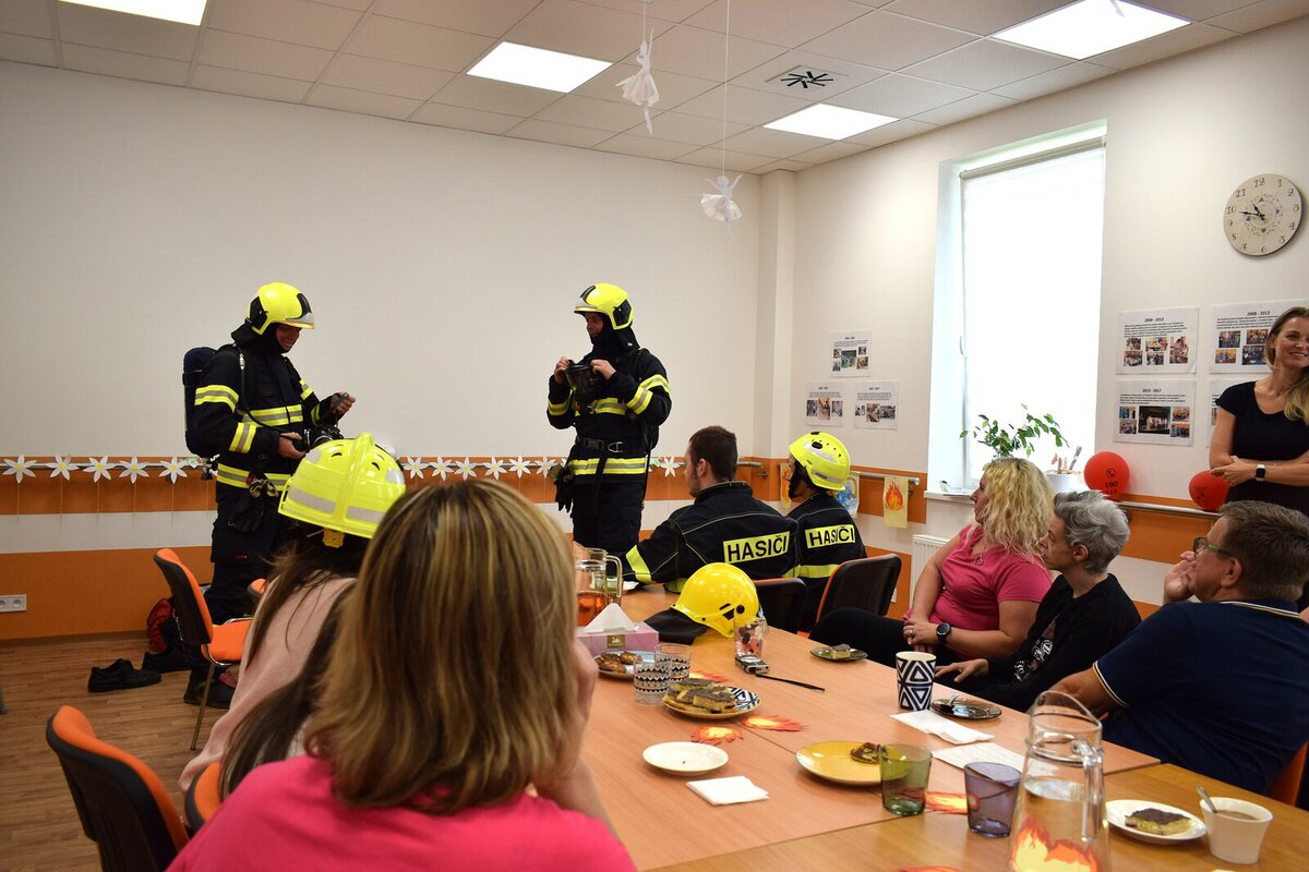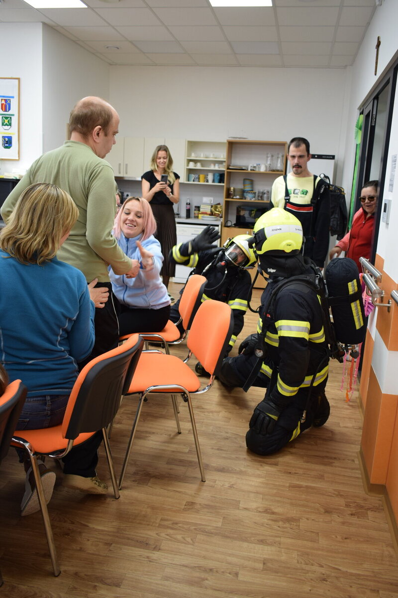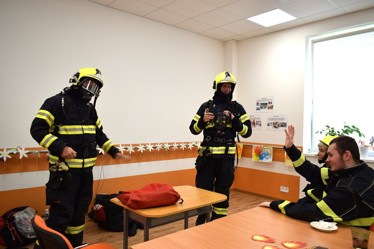 Do stacionáře dorazili se svou profesionální výstrojí Libor Šuhajda s kolegou Stanislavem Kocúrem a svým přístupem si hned všechny získali. „Víte, co děláme? Viděli jste nás někde?“ ptali se záchranáři a uživatelé jim okamžitě odpovídali. Také měli na záchranáře spoustu otázek. Nejvíce je ale zaujaly jejich obleky a helmy, které si okamžitě rádi vyzkoušeli. Hasiči při vyprávění o své práci, o zásazích, které dělají, vyprávěli i o nebezpečí, které na ně číhá v hořících objektech. „Můžeme vám ukázat, jak vypadáme u ohně, abyste se nás nebáli? Kolega Standa si dá masku a bude vypadat jako takový ufoun. Bojíte se ho?“ zeptal se Libor Šuhajda uživatelů, kteří s nadšením sledovali proměnu hasiče, který po nasazení kukly a masky nebyl k poznání. I jeho hlas zněl přes masku jinak, ale uživatelé se jej nezalekli, což hasiče potěšilo. „Víte, pro nás je důležité tohle trénovat, aby z nás v případě akce neměli lidé strach,“ vysvětlil Libor Šuhajda.