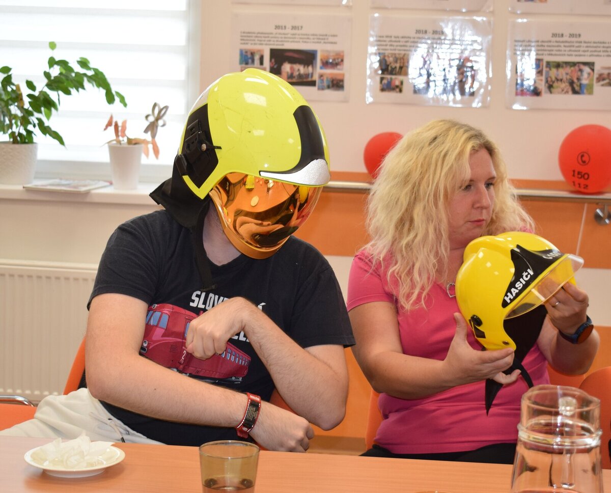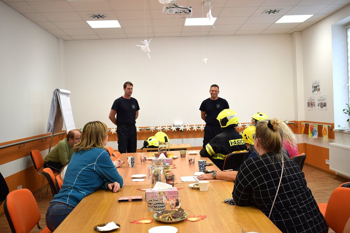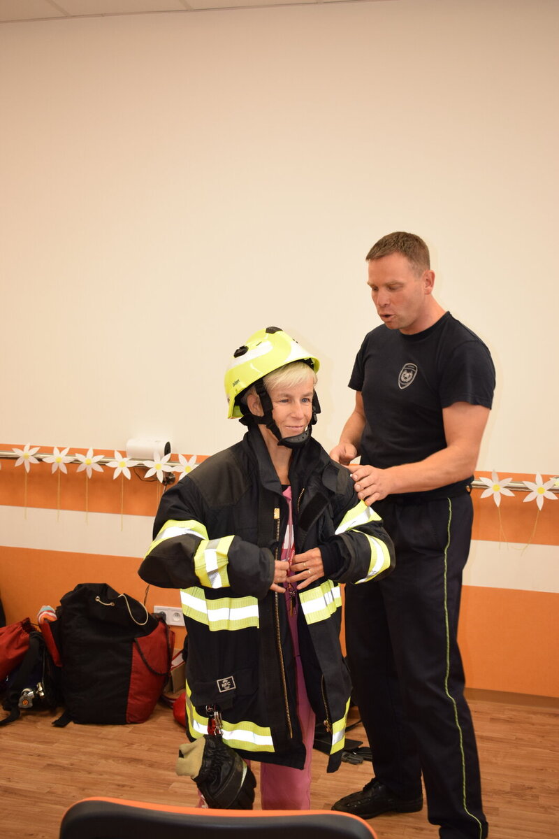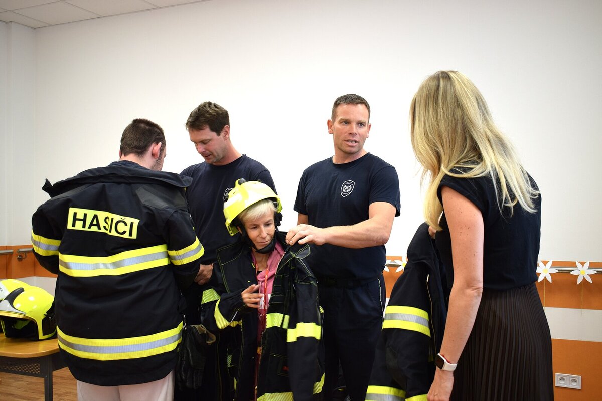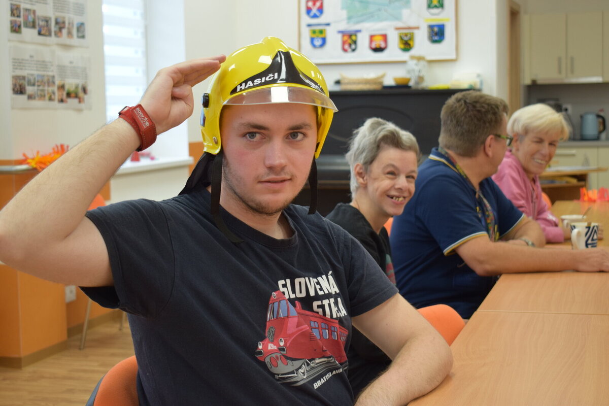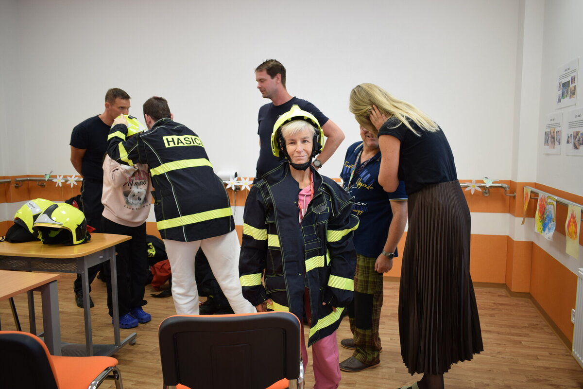 Do stacionáře dorazili se svou profesionální výstrojí Libor Šuhajda s kolegou Stanislavem Kocúrem a svým přístupem si hned všechny získali. „Víte, co děláme? Viděli jste nás někde?“ ptali se záchranáři a uživatelé jim okamžitě odpovídali. Také měli na záchranáře spoustu otázek. Nejvíce je ale zaujaly jejich obleky a helmy, které si okamžitě rádi vyzkoušeli. Hasiči při vyprávění o své práci, o zásazích, které dělají, vyprávěli i o nebezpečí, které na ně číhá v hořících objektech. „Můžeme vám ukázat, jak vypadáme u ohně, abyste se nás nebáli? Kolega Standa si dá masku a bude vypadat jako takový ufoun. Bojíte se ho?“ zeptal se Libor Šuhajda uživatelů, kteří s nadšením sledovali proměnu hasiče, který po nasazení kukly a masky nebyl k poznání. I jeho hlas zněl přes masku jinak, ale uživatelé se jej nezalekli, což hasiče potěšilo. „Víte, pro nás je důležité tohle trénovat, aby z nás v případě akce neměli lidé strach,“ vysvětlil Libor Šuhajda.