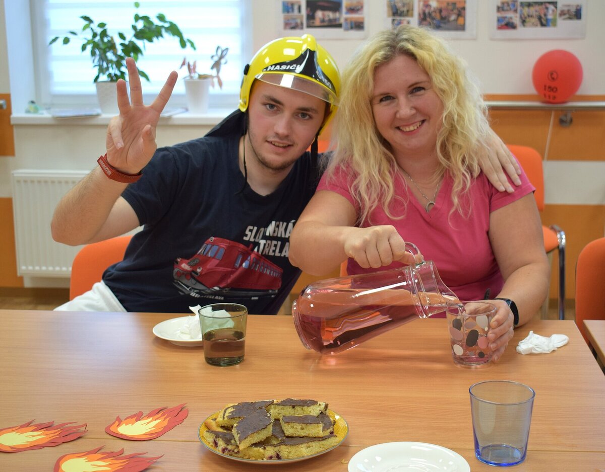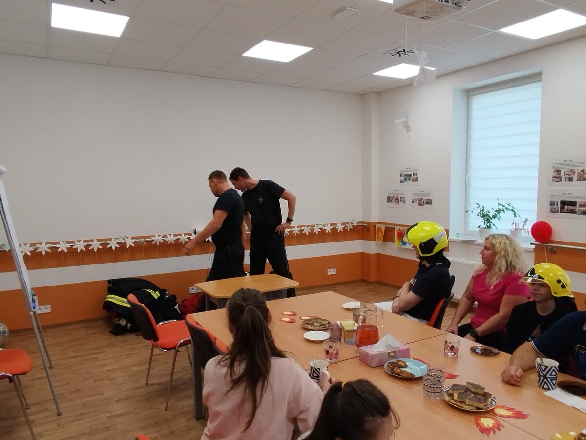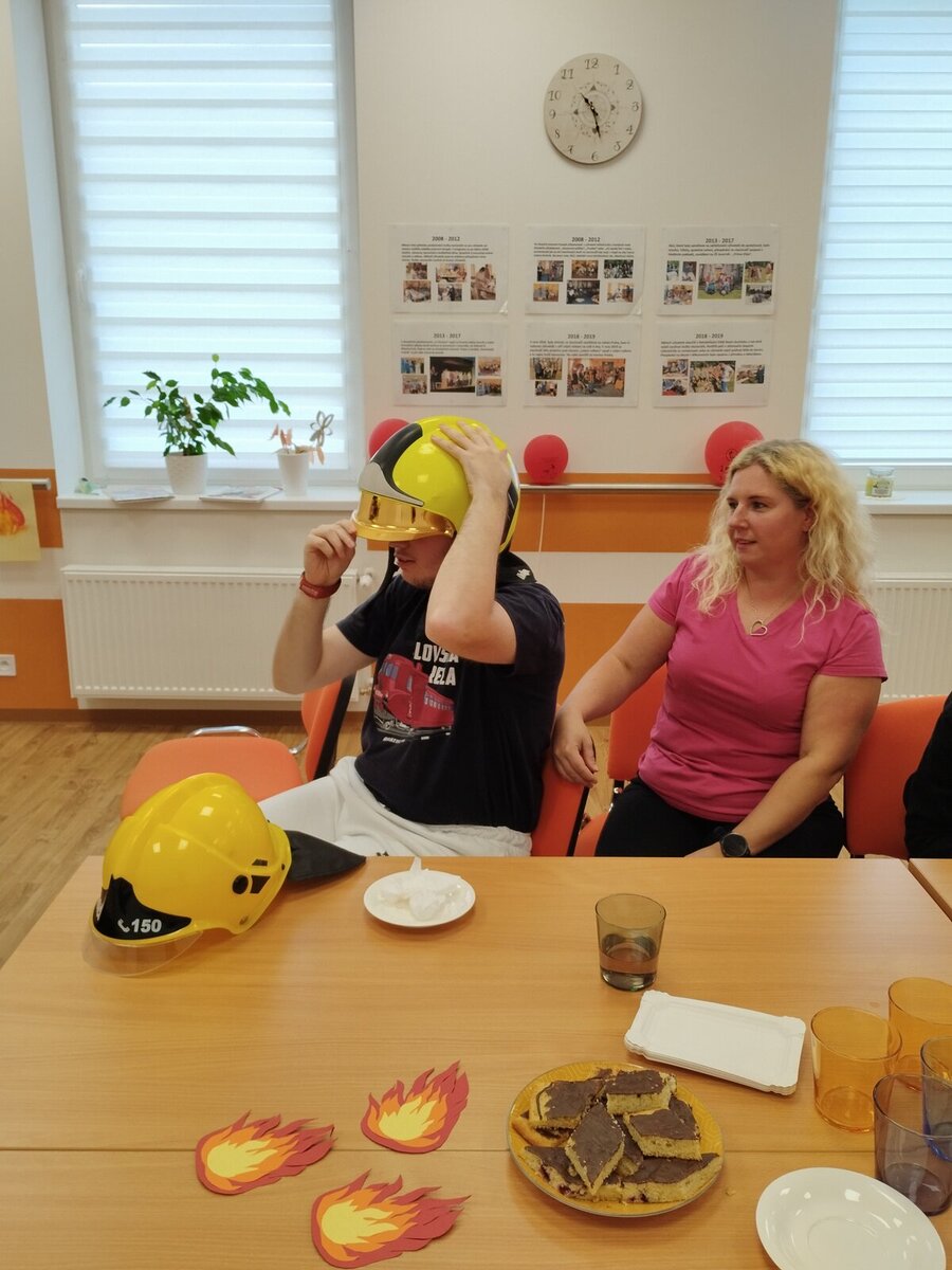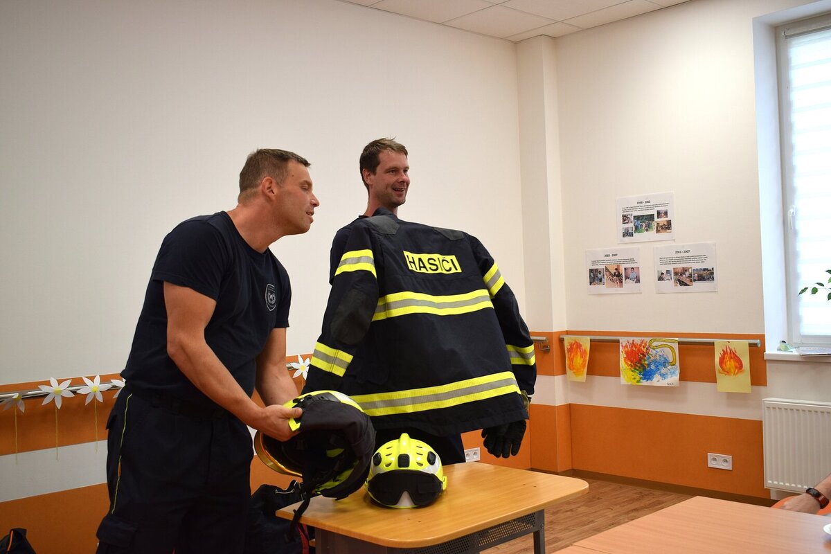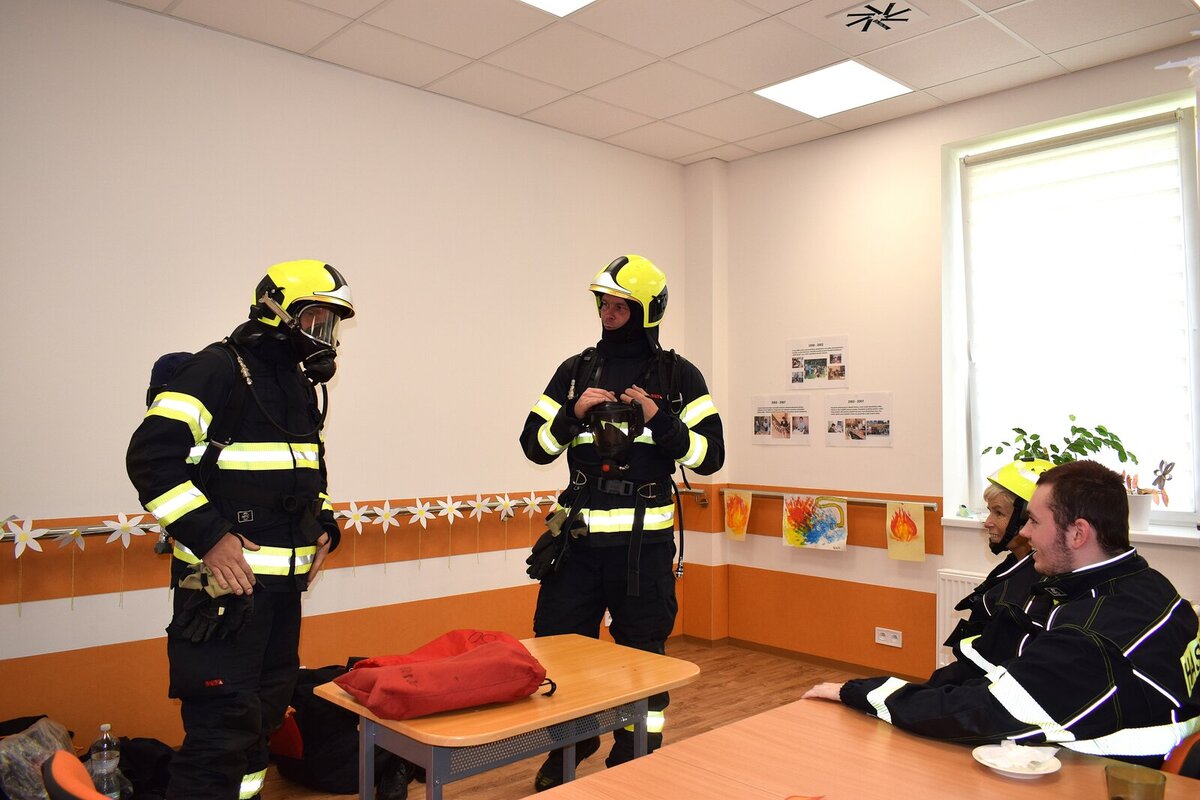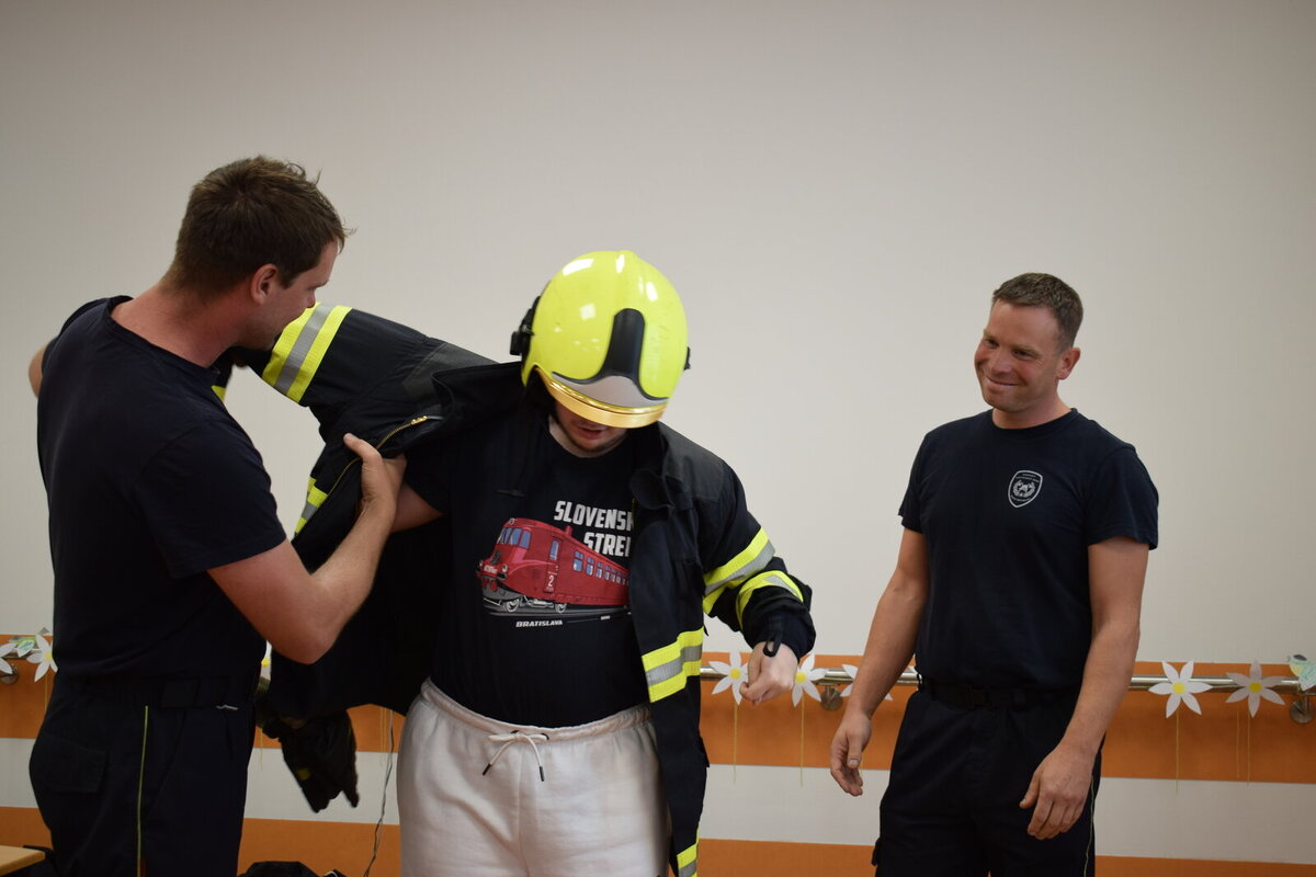 Do stacionáře dorazili se svou profesionální výstrojí Libor Šuhajda s kolegou Stanislavem Kocúrem a svým přístupem si hned všechny získali. „Víte, co děláme? Viděli jste nás někde?“ ptali se záchranáři a uživatelé jim okamžitě odpovídali. Také měli na záchranáře spoustu otázek. Nejvíce je ale zaujaly jejich obleky a helmy, které si okamžitě rádi vyzkoušeli. Hasiči při vyprávění o své práci, o zásazích, které dělají, vyprávěli i o nebezpečí, které na ně číhá v hořících objektech. „Můžeme vám ukázat, jak vypadáme u ohně, abyste se nás nebáli? Kolega Standa si dá masku a bude vypadat jako takový ufoun. Bojíte se ho?“ zeptal se Libor Šuhajda uživatelů, kteří s nadšením sledovali proměnu hasiče, který po nasazení kukly a masky nebyl k poznání. I jeho hlas zněl přes masku jinak, ale uživatelé se jej nezalekli, což hasiče potěšilo. „Víte, pro nás je důležité tohle trénovat, aby z nás v případě akce neměli lidé strach,“ vysvětlil Libor Šuhajda.