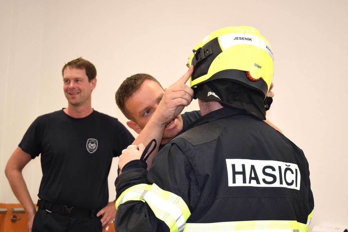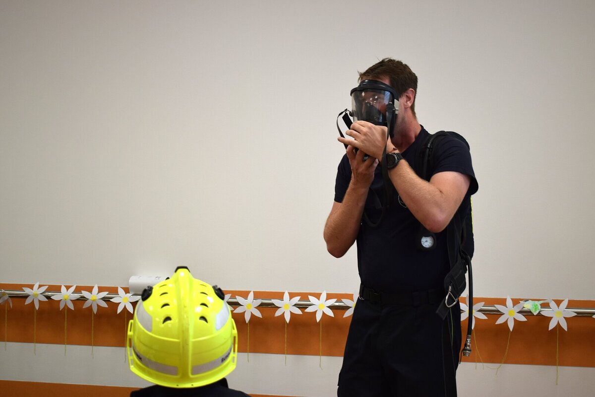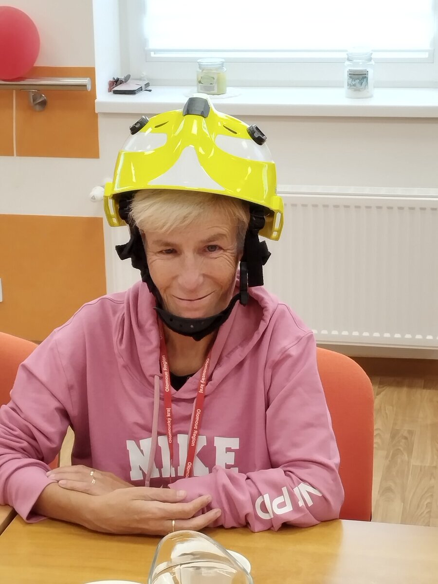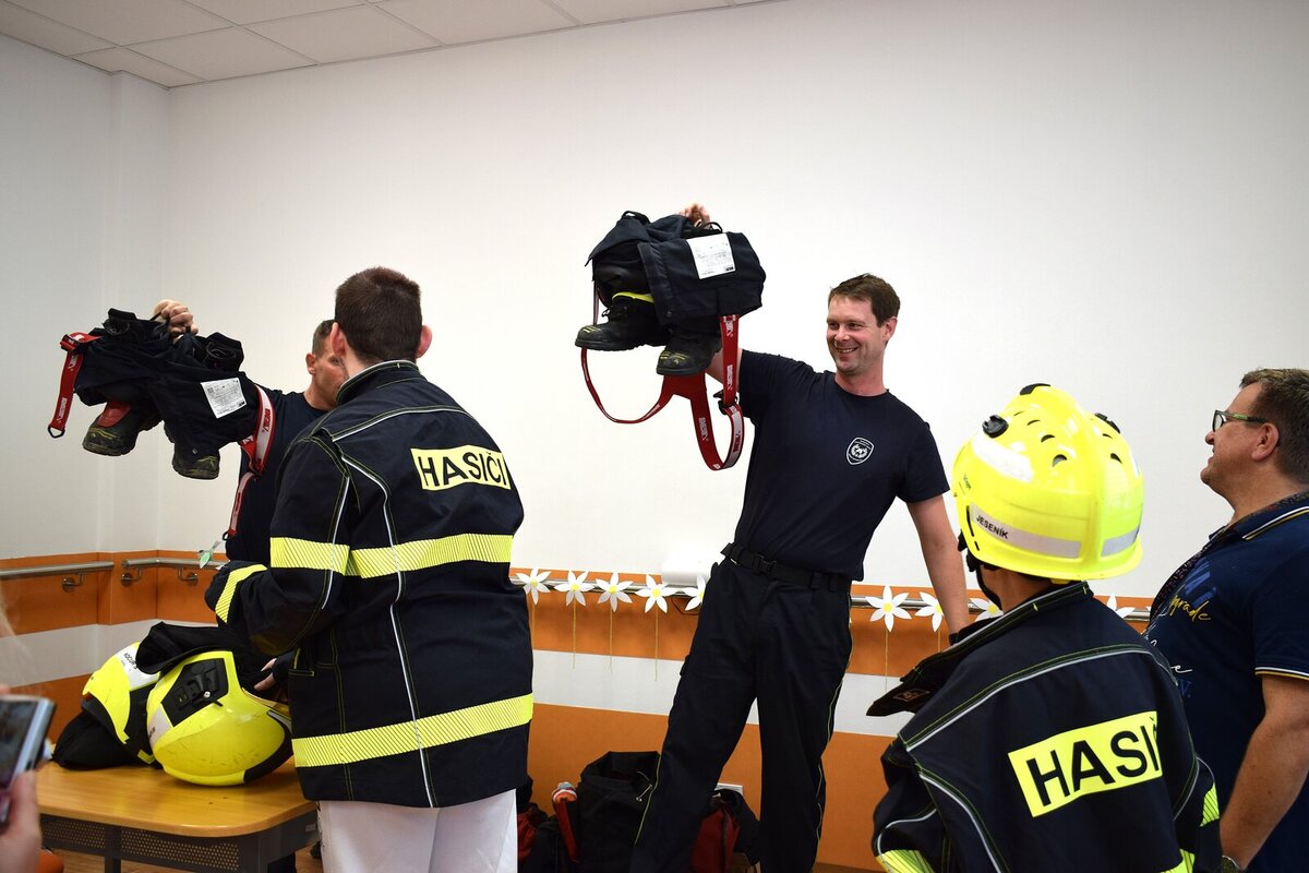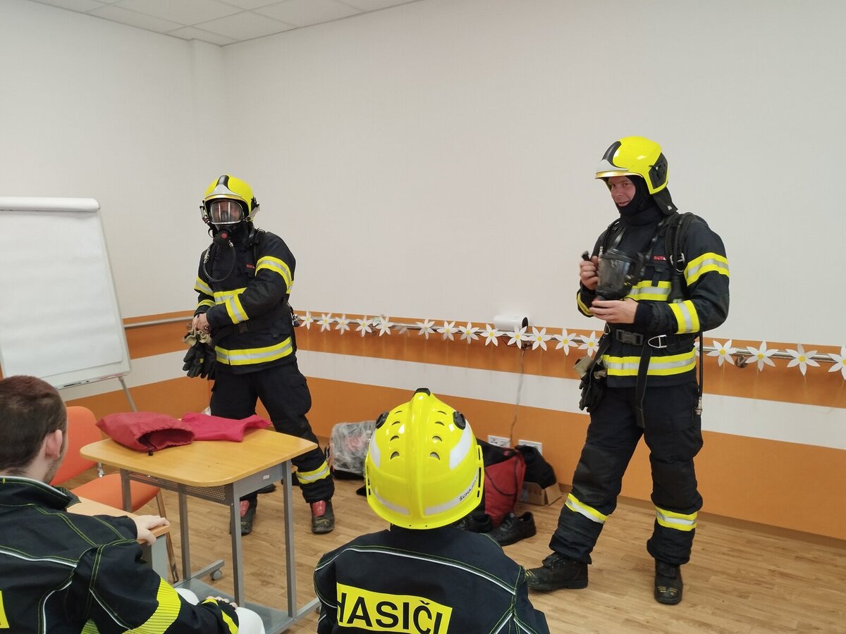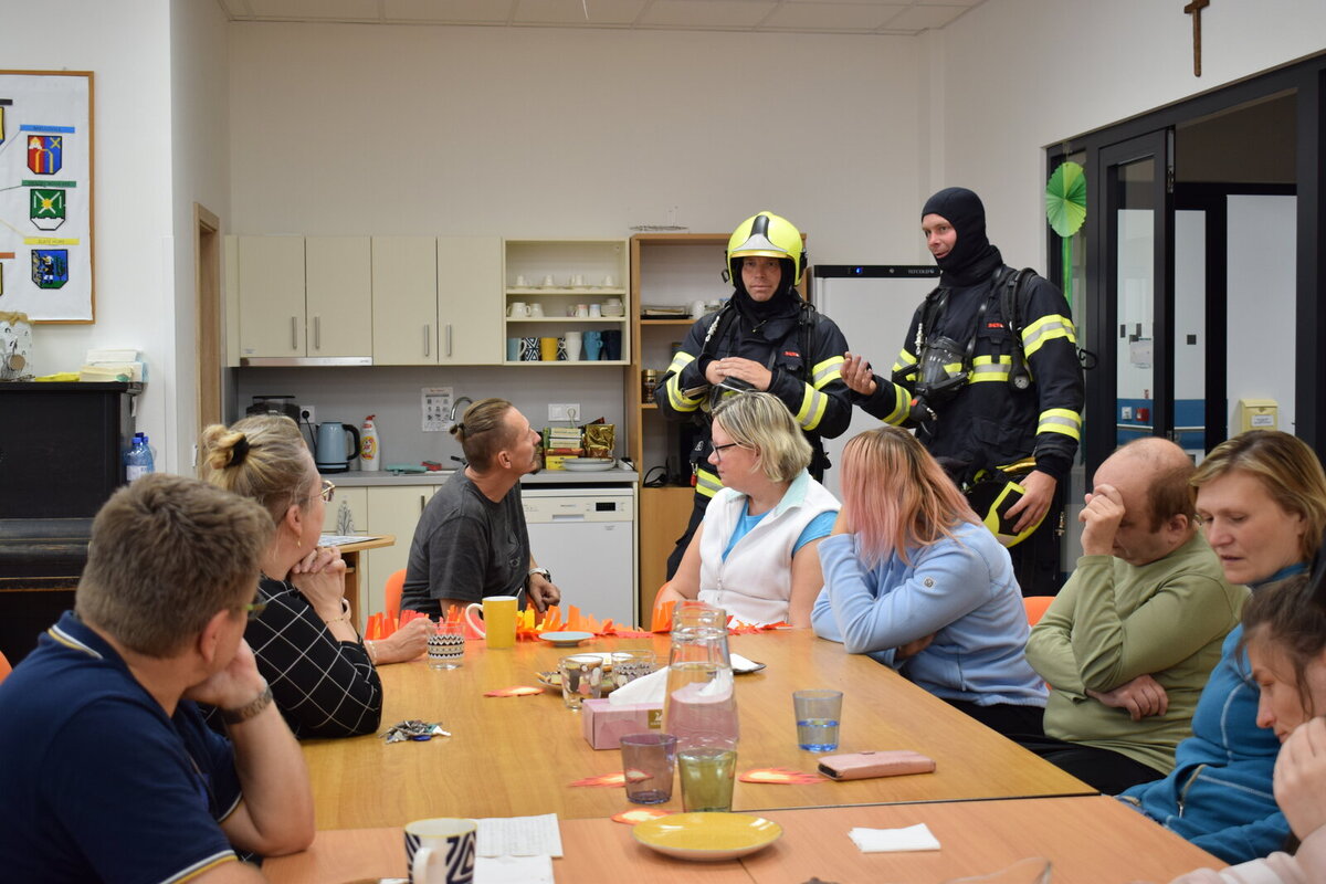 Do stacionáře dorazili se svou profesionální výstrojí Libor Šuhajda s kolegou Stanislavem Kocúrem a svým přístupem si hned všechny získali. „Víte, co děláme? Viděli jste nás někde?“ ptali se záchranáři a uživatelé jim okamžitě odpovídali. Také měli na záchranáře spoustu otázek. Nejvíce je ale zaujaly jejich obleky a helmy, které si okamžitě rádi vyzkoušeli. Hasiči při vyprávění o své práci, o zásazích, které dělají, vyprávěli i o nebezpečí, které na ně číhá v hořících objektech. „Můžeme vám ukázat, jak vypadáme u ohně, abyste se nás nebáli? Kolega Standa si dá masku a bude vypadat jako takový ufoun. Bojíte se ho?“ zeptal se Libor Šuhajda uživatelů, kteří s nadšením sledovali proměnu hasiče, který po nasazení kukly a masky nebyl k poznání. I jeho hlas zněl přes masku jinak, ale uživatelé se jej nezalekli, což hasiče potěšilo. „Víte, pro nás je důležité tohle trénovat, aby z nás v případě akce neměli lidé strach,“ vysvětlil Libor Šuhajda.