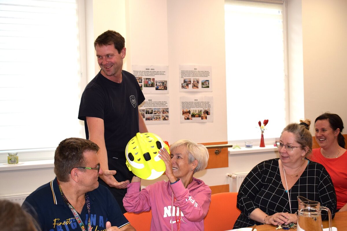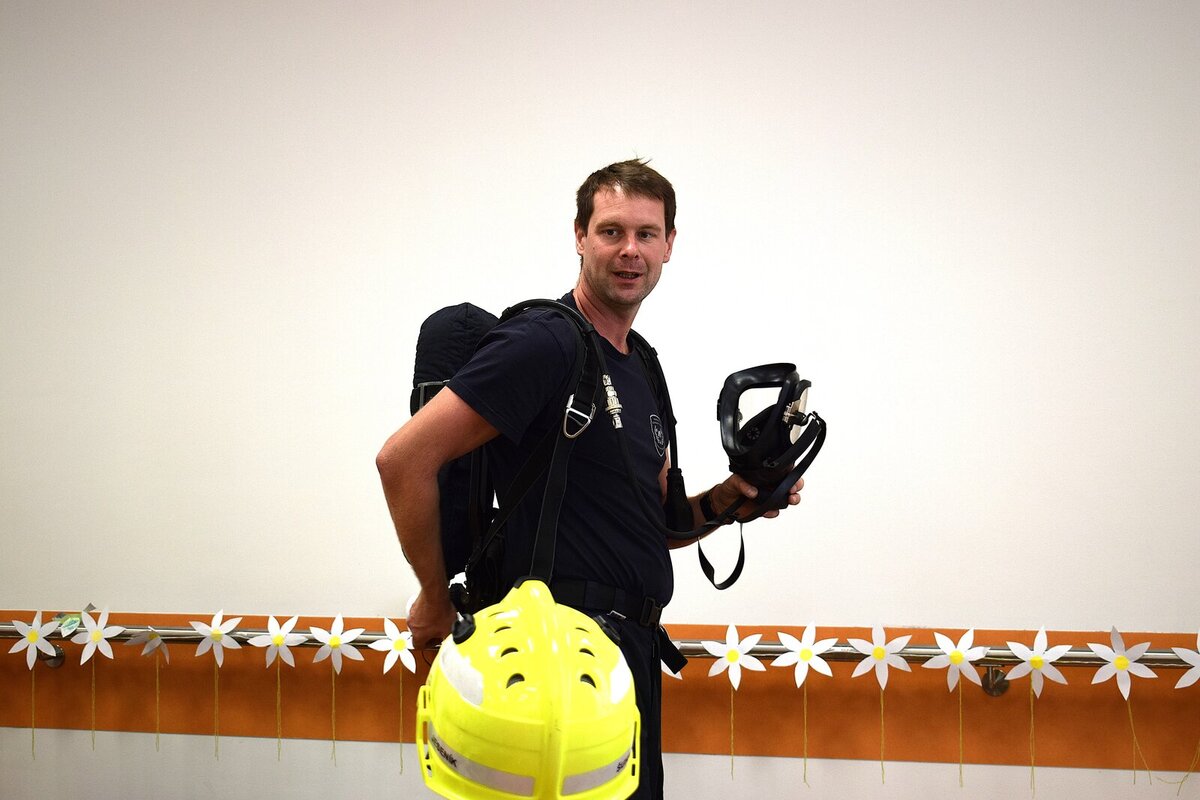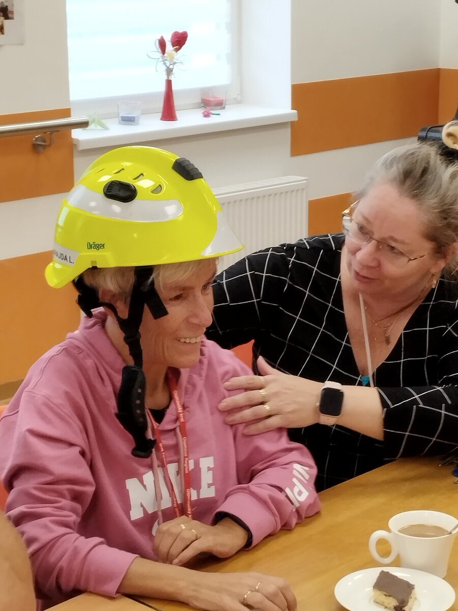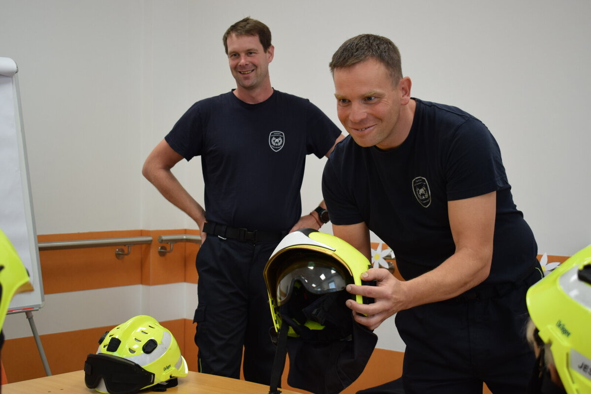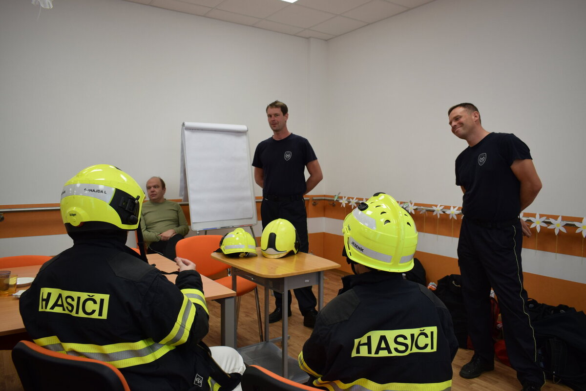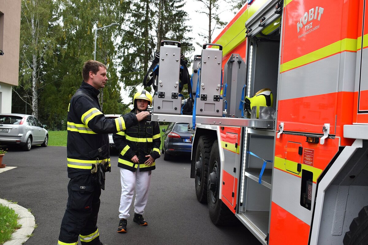 Do stacionáře dorazili se svou profesionální výstrojí Libor Šuhajda s kolegou Stanislavem Kocúrem a svým přístupem si hned všechny získali. „Víte, co děláme? Viděli jste nás někde?“ ptali se záchranáři a uživatelé jim okamžitě odpovídali. Také měli na záchranáře spoustu otázek. Nejvíce je ale zaujaly jejich obleky a helmy, které si okamžitě rádi vyzkoušeli. Hasiči při vyprávění o své práci, o zásazích, které dělají, vyprávěli i o nebezpečí, které na ně číhá v hořících objektech. „Můžeme vám ukázat, jak vypadáme u ohně, abyste se nás nebáli? Kolega Standa si dá masku a bude vypadat jako takový ufoun. Bojíte se ho?“ zeptal se Libor Šuhajda uživatelů, kteří s nadšením sledovali proměnu hasiče, který po nasazení kukly a masky nebyl k poznání. I jeho hlas zněl přes masku jinak, ale uživatelé se jej nezalekli, což hasiče potěšilo. „Víte, pro nás je důležité tohle trénovat, aby z nás v případě akce neměli lidé strach,“ vysvětlil Libor Šuhajda.