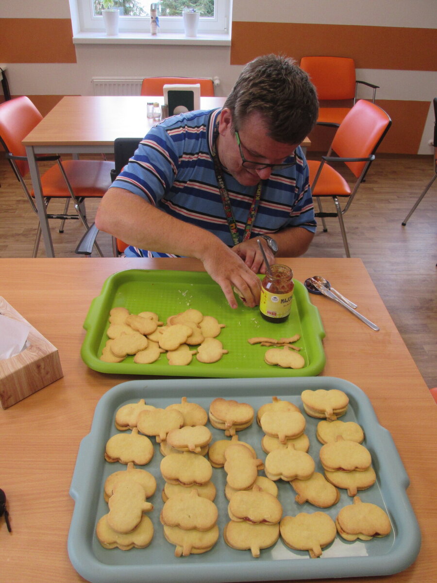 Denní stacionář Šimon přijal pozvání k návštěvě do Denního stacionáře pro seniory v Jeseníku. Den setkání, které se mělo uskutečnit 30.9.2025, se pomalu přiblížil, a tak si uživatelé připravili pro společné posezení sladké překvapení. Společně upekli linecké cukroví ve tvaru dýně. U tohoto pečení si také stihli zahrát i společenské hry.