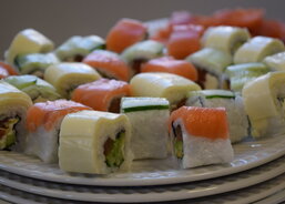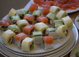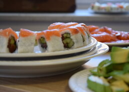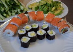 Kilo jasmínové rýže se 20 - 30 minut vaří v litru vody spolu se čtvrt litrem octu na přípravu sushi, 200 g cukru a špetkou soli. Losos se den před zpracováním nakládá do směsi soli a cukru. Po čtyřech hodinách v pokojové teplotě se ukládá na noc do lednice a následující den se nakrájí na tenké plátky. K přípravě delikatesy je třeba mít také řasy nori, avokádo, okurek, sýr Philadelfia a toustový sýr. Tak to alespoň mají rádi na Ukrajině. Pak už stačí vzít suroviny, pod správným tlakem je srolovat a mistrovsky nakrájet. Nezdá se to, ale je to fuška. Jen si zkuste zakrojit a rýžovou parádu nerozmačkat. Pak už stačí popřát - dobrou chuť.