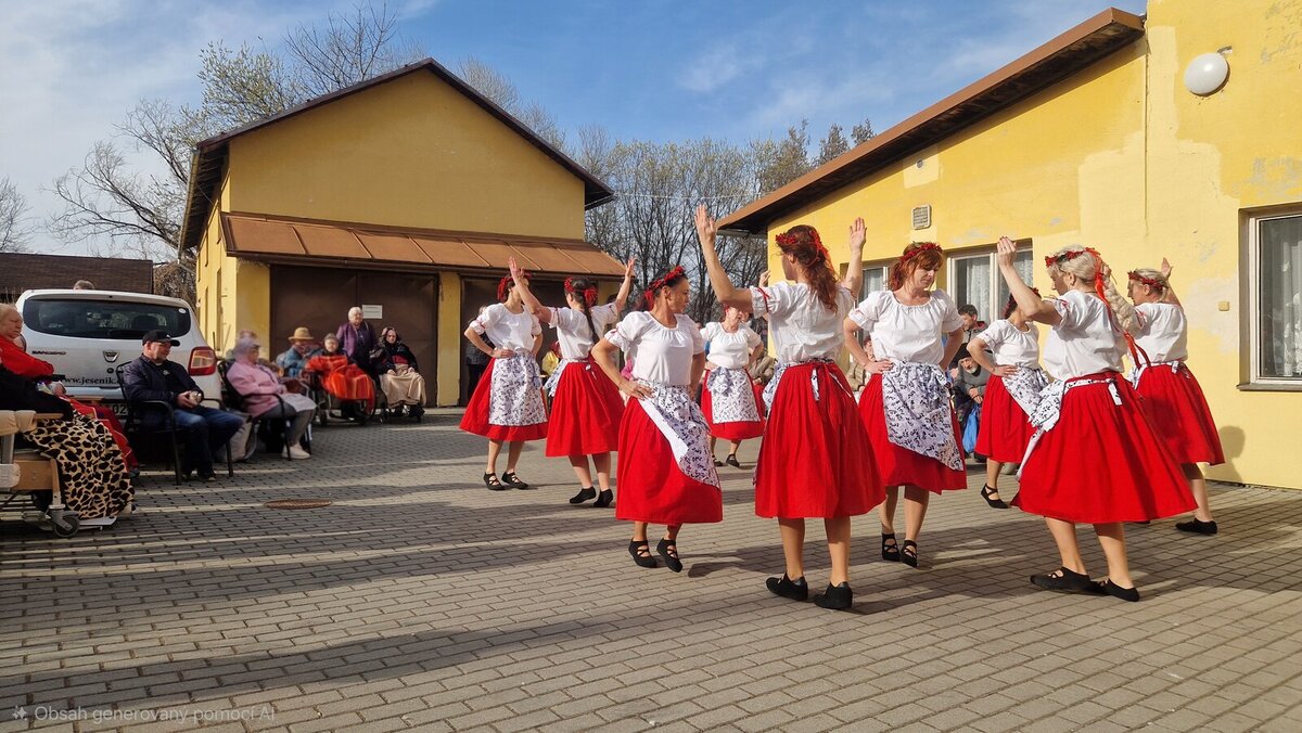 Slavnostní náladu v domově završilo nedělní vystoupení členek souboru Borůvěnka. „Tanečnice byly krásně sladěné ve stejných šatech. Našim klientům představily tři taneční čísla a svým vystoupením jim rozzářily celé odpoledne,“ uvedla koordinátorka péče Vladislava Koisová.