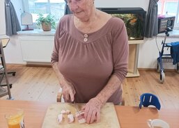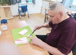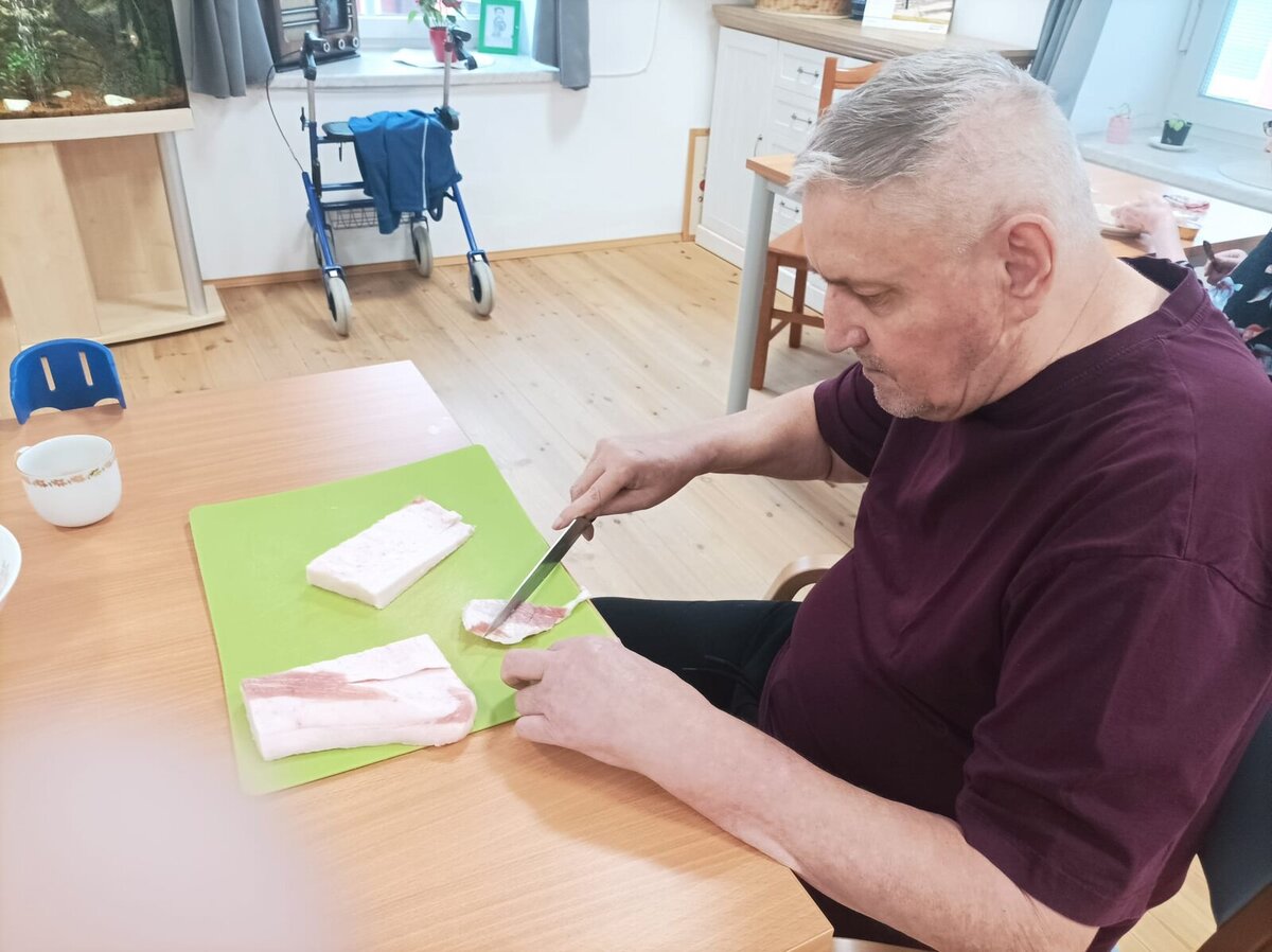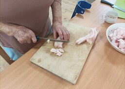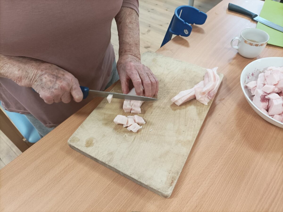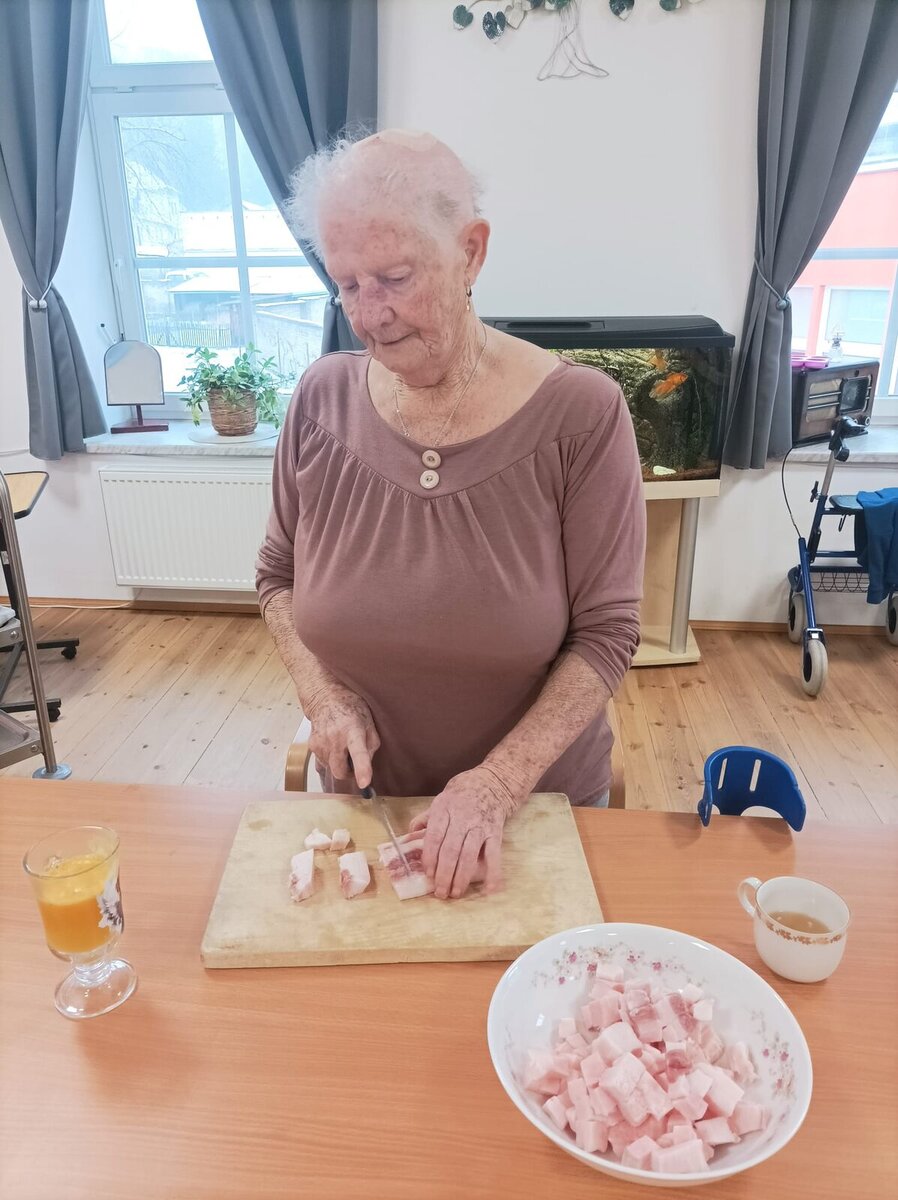 Krájení syrového sádla bylo pěknou aktivizací, při níž si senioři procvičili ruce a zároveň si je pořádně „promastili“. Nechybělo ani povídání a vzpomínání na to, kdo si doma škvařil vlastní sádlo, chystal zabíjačky a jaké tradice se při nich dodržovaly.