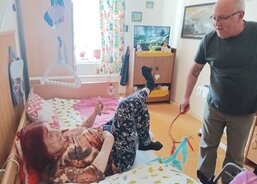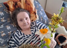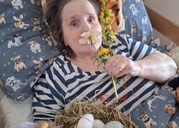Na Velikonoční pondělí panovala v domově veselá a spokojená nálada. Pečovatelka paní Krajčiová chtěla potěšit paní Podhornou, jejíž je patronkou. Tato seniorka se vlivem nemoci nemůže vyjadřovat slovně, komunikuje očima. „Přinesla jí luční květiny ze zahrádky, aby si mohla přivonět a nasát jarní atmosféru. Paní Podhorná komunikuje neverbálně, ale i tak dala najevo radost,“ vysvětlila koordinátorka péče Vladislava Koisová. Velkou radost udělal klientkám pečovatel pan Handák, který nezapomněl na velikonoční tradici. „Přinesl si pomlázku a některé klientky a zdravotní sestřičku obešel s pomlázkou,“ dodala Koisová.